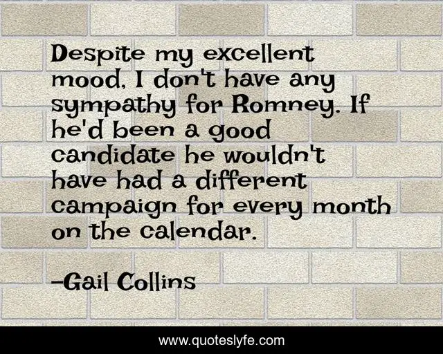 This page presents the quote "Despite my excellent mood, I don't have any sympathy for Romney. If he'd been a good candidate he wouldn't have had a different campaign for every month on the calendar.". Author of this quote is Gail Collins. This quote is about good, mood, excellent,.