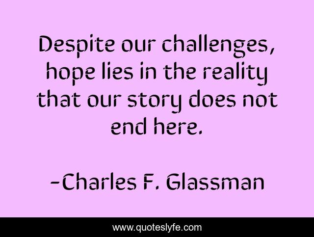 This page presents the quote "Despite our challenges, hope lies in the reality that our story does not end here.". Author of this quote is Charles F. Glassman. This quote is about faith, confidence, positive, motivational, journey, optimistic, inspirational, enthusiasm, hope,.