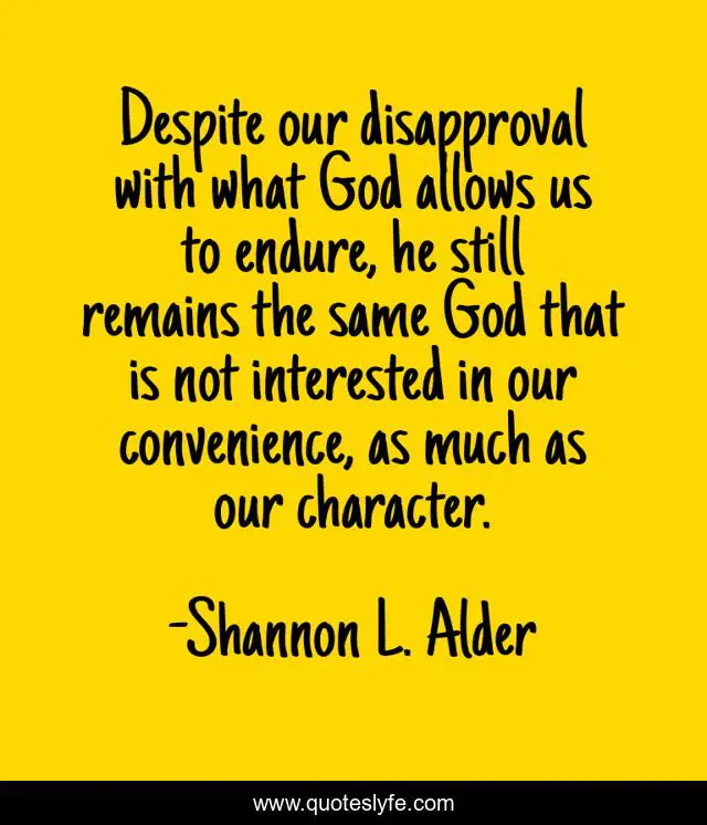 This page presents the quote "Despite our disapproval with what God allows us to endure, he still remains the same God that is not interested in our convenience, as much as our character.". Author of this quote is Shannon L. Alder. This quote is about annoyance, enduring, god, hard-lessons, character, cruelty, disappointments, judgement, rising-above-it,.