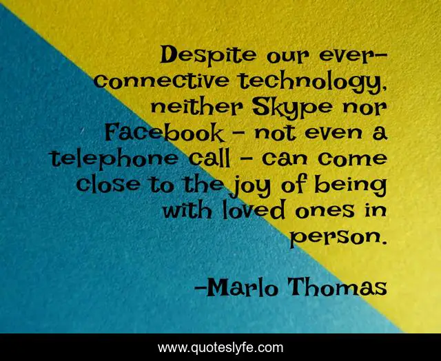This page presents the quote "Despite our ever-connective technology, neither Skype nor Facebook - not even a telephone call - can come close to the joy of being with loved ones in person.". Author of this quote is Marlo Thomas. This quote is about joy, loved, person,.