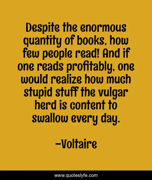 This page presents the quote "Despite the enormous quantity of books, how few people read! And if one reads profitably, one would realize how much stupid stuff the vulgar herd is content to swallow every day.". Author of this quote is Voltaire. This quote is about books, reading,.