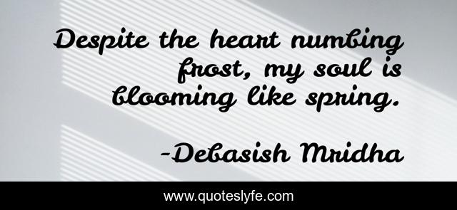 This page presents the quote "Despite the heart numbing frost, my soul is blooming like spring.". Author of this quote is Debasish Mridha. This quote is about philosophy, spring, frost, debasish-mridha, soul, quotes, inspirational, enthusiasm, soul-blooming-like-spring,.
