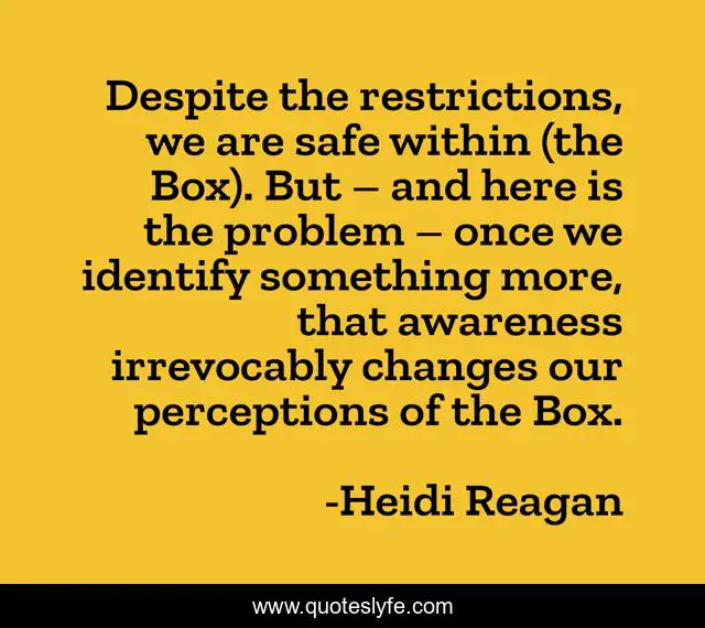 This page presents the quote "Despite the restrictions, we are safe within (the Box). But – and here is the problem – once we identify something more, that awareness irrevocably changes our perceptions of the Box.". Author of this quote is Heidi Reagan. This quote is about restriction, the-box, perception, bold-passion, choice, perceptions, passion, identity, safety,.