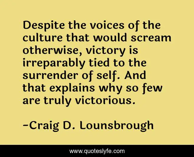 This page presents the quote "Despite the voices of the culture that would scream otherwise, victory is irreparably tied to the surrender of self. And that explains why so few are truly victorious.". Author of this quote is Craig D. Lounsbrough. This quote is about selfish, success, give, successful, grant, self-sacrifice, giving, victory, culture,.