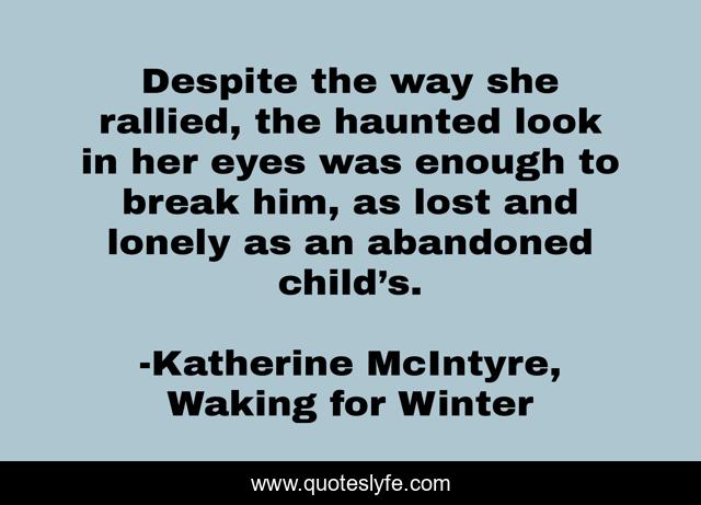 This page presents the quote "Despite the way she rallied, the haunted look in her eyes was enough to break him, as lost and lonely as an abandoned child’s.". Author of this quote is Katherine McIntyre, Waking for Winter. This quote is about rallied, brokenness, broken, cami-akiyama, philadelphia, abandoned-child, failure, haunted, defeat,.