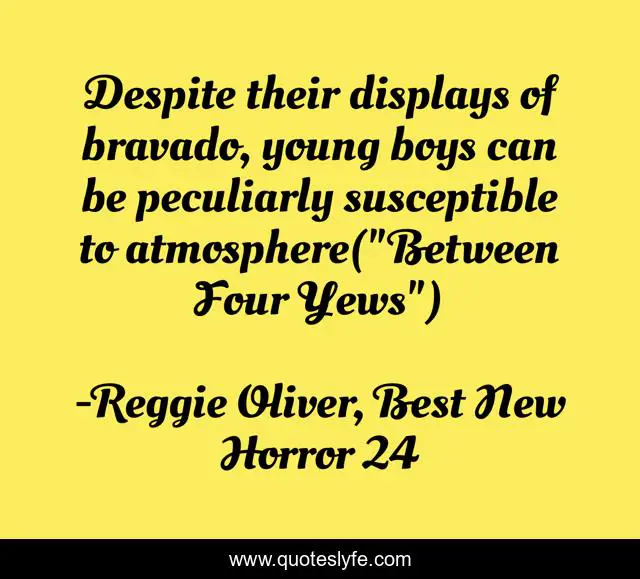 "Reggie Oliver, Best New Horror 24 Quotes." Quoteslyfe.com, 2025. Sat. 06 Dec. 2025. <https://www.quoteslyfe.com/quote/Despite-their-displays-of-bravado-young-boys-100134>.