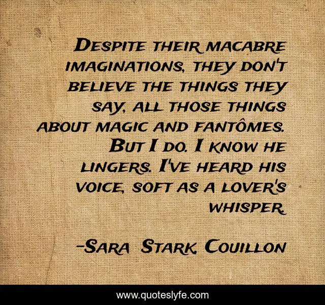 This page presents the quote "Despite their macabre imaginations, they don't believe the things they say, all those things about magic and fantômes. But I do. I know he lingers. I've heard his voice, soft as a lover's whisper.". Author of this quote is Sara Stark, Couillon. This quote is about dark, women-s-fiction, literary-fiction,.
