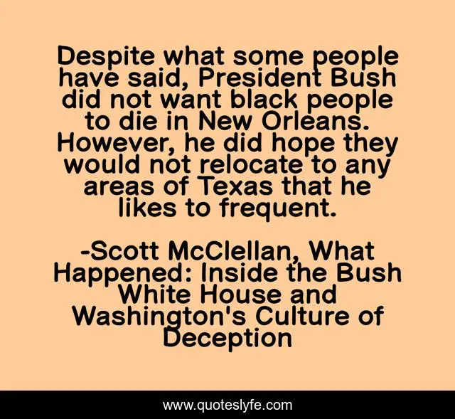 This page presents the quote "Despite what some people have said, President Bush did not want black people to die in New Orleans. However, he did hope they would not relocate to any areas of Texas that he likes to frequent.". Author of this quote is Scott McClellan, What Happened: Inside the Bush White House and Washington's Culture of Deception. This quote is about new-orleans, bush, katrina, racism,.