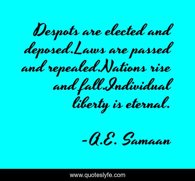This page presents the quote "Despots are elected and deposed.Laws are passed and repealed.Nations rise and fall.Individual liberty is eternal.". Author of this quote is A.E. Samaan. This quote is about tyranny, individual-rights, tyrants, despots, libertarianism, liberty, individual-liberty, libertarian,.
