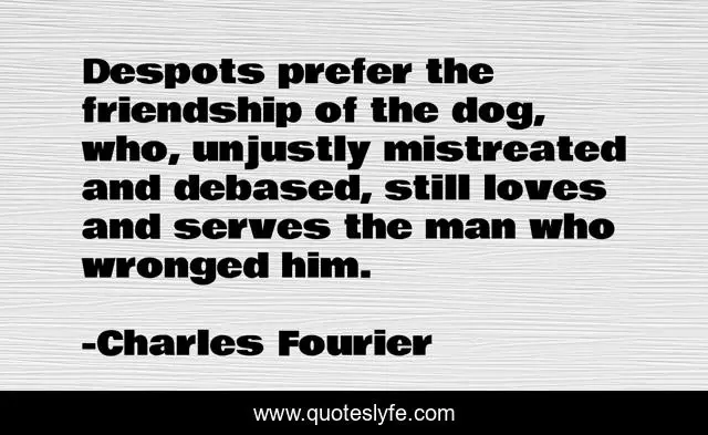 This page presents the quote "Despots prefer the friendship of the dog, who, unjustly mistreated and debased, still loves and serves the man who wronged him.". Author of this quote is Charles Fourier. This quote is about poltics, despots, tyrants, liberty, government,.