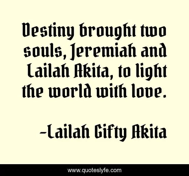 "Lailah Gifty Akita Quotes." Quoteslyfe.com, 2025. Mon. 08 Dec. 2025. <https://www.quoteslyfe.com/quote/Destiny-brought-two-souls-Jeremiah-and-Lailah-77044>.