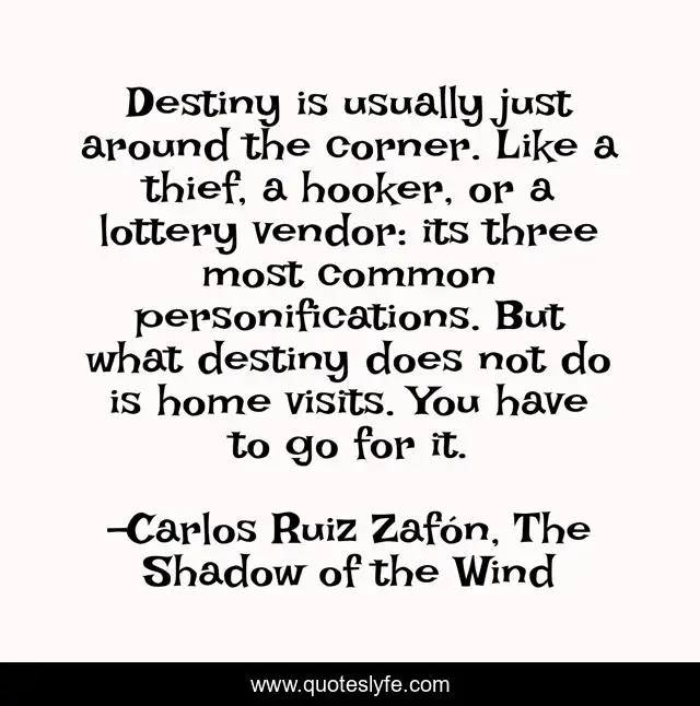 This page presents the quote "Destiny is usually just around the corner. Like a thief, a hooker, or a lottery vendor: its three most common personifications. But what destiny does not do is home visits. You have to go for it.". Author of this quote is Carlos Ruiz Zafón, The Shadow of the Wind. .