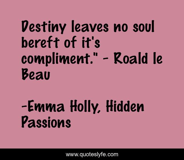 This page presents the quote "Destiny leaves no soul bereft of it's compliment." - Roald le Beau". Author of this quote is Emma Holly, Hidden Passions. This quote is about beautiful, meaningful,.