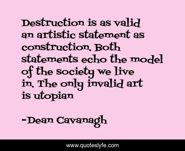 This page presents the quote "Destruction is as valid an artistic statement as construction. Both statements echo the model of the society we live in. The only invalid art is utopian". Author of this quote is Dean Cavanagh. This quote is about art, utopian, destruction,.
