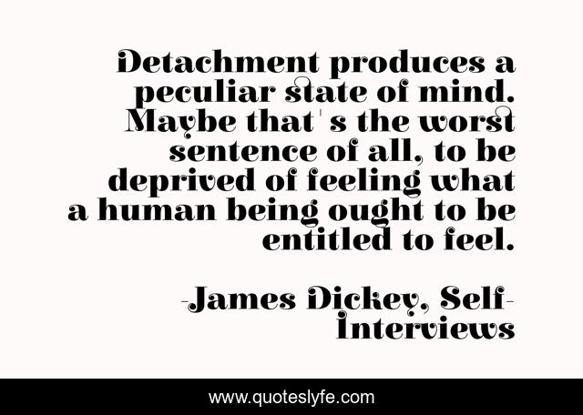 This page presents the quote "Detachment produces a peculiar state of mind. Maybe that's the worst sentence of all, to be deprived of feeling what a human being ought to be entitled to feel.". Author of this quote is James Dickey, Self-Interviews. This quote is about humans, emotions, feelings, detachment, numbers, humanity,.