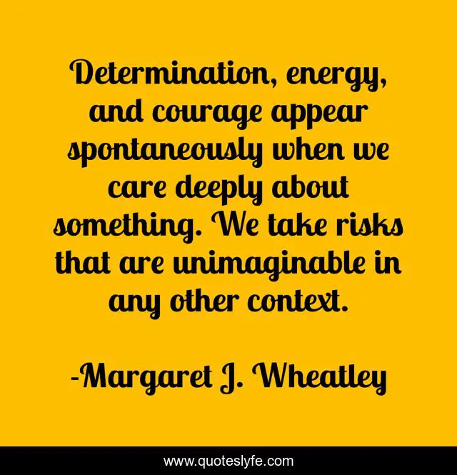This page presents the quote "Determination, energy, and courage appear spontaneously when we care deeply about something. We take risks that are unimaginable in any other context.". Author of this quote is Margaret J. Wheatley. This quote is about courage, determination,.