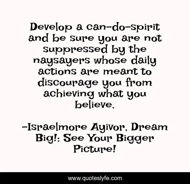 "Israelmore Ayivor, Dream Big!: See Your Bigger Picture! Quotes." Quoteslyfe.com, 2025. Sun. 07 Dec. 2025. <https://www.quoteslyfe.com/quote/Develop-a-can-do-spirit-and-be-106010>.