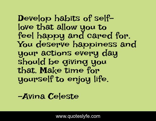 This page presents the quote "Develop habits of self-love that allow you to feel happy and cared for. You deserve happiness and your actions every day should be giving you that. Make time for yourself to enjoy life.". Author of this quote is Avina Celeste. This quote is about life, positive, motivational, self-love, optimistic, inspirational, enthusiasm, happiness, confidence,.