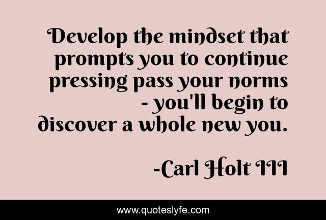 This page presents the quote "Develop the mindset that prompts you to continue pressing pass your norms - you'll begin to discover a whole new you.". Author of this quote is Carl Holt III. This quote is about life, knowledge, positive, motivational, confidence, wisdom, optimistic, inspirational, self-help,.