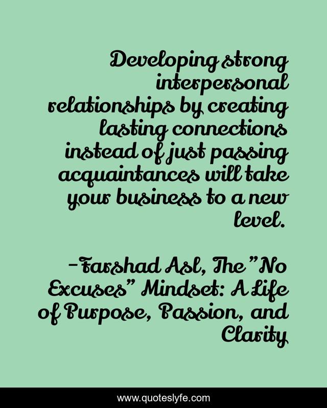 This page presents the quote "Developing strong interpersonal relationships by creating lasting connections instead of just passing acquaintances will take your business to a new level.". Author of this quote is Farshad Asl, The "No Excuses" Mindset: A Life of Purpose, Passion, and Clarity. This quote is about business, interpersonal-relationships, developing-leadership-skills, success, long-lasting-connections,.