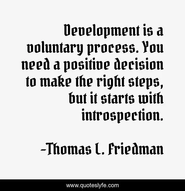 This page presents the quote "Development is a voluntary process. You need a positive decision to make the right steps, but it starts with introspection.". Author of this quote is Thomas L. Friedman. This quote is about maturation, discipleship, humility,.