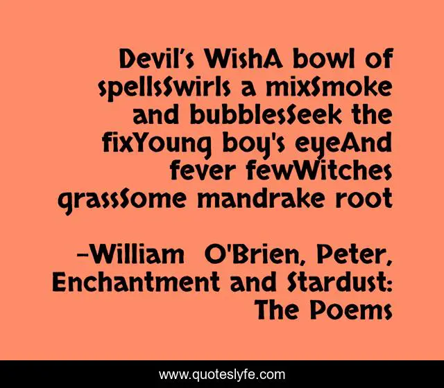This page presents the quote "Devil’s WishA bowl of spellsSwirls a mixSmoke and bubblesSeek the fixYoung boy's eyeAnd fever fewWitches grassSome mandrake root". Author of this quote is William O'Brien, Peter, Enchantment and Stardust: The Poems. This quote is about devil, magic, enchanted, witch, poems, spells,.