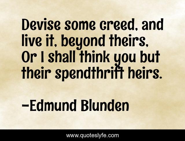 This page presents the quote "Devise some creed, and live it, beyond theirs, Or I shall think you but their spendthrift heirs.". Author of this quote is Edmund Blunden. This quote is about inheritance, history, modernism,.