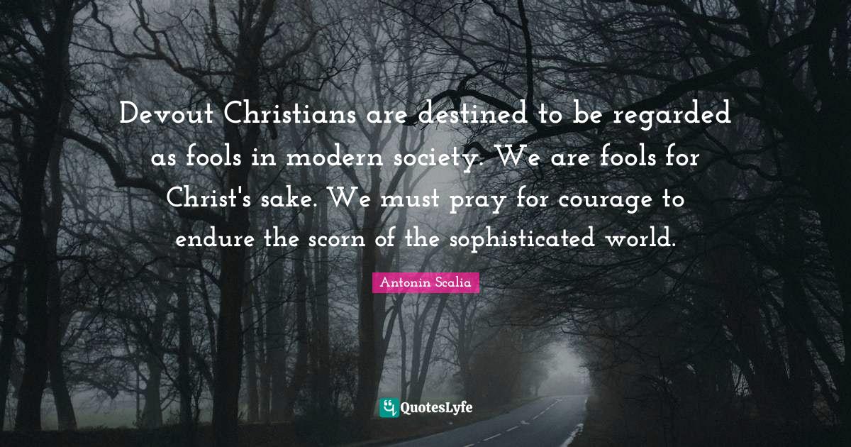 This page presents the quote "Devout Christians are destined to be regarded as fools in modern society. We are fools for Christ's sake. We must pray for courage to endure the scorn of the sophisticated world.". Author of this quote is Antonin Scalia. This quote is about courage, christian, scorn, sophisticated, endure, christ, scary, sake, modern society,.