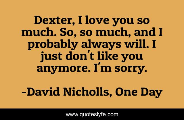 This page presents the quote "Dexter, I love you so much. So, so much, and I probably always will. I just don't like you anymore. I'm sorry.". Author of this quote is David Nicholls, One Day. This quote is about one-day, love, sorry, affection, one-day-david-nicholls,.
