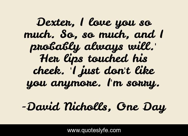 This page presents the quote "Dexter, I love you so much. So, so much, and I probably always will.' Her lips touched his cheek. 'I just don't like you anymore. I'm sorry.". Author of this quote is David Nicholls, One Day. This quote is about friendship, love, affection,.