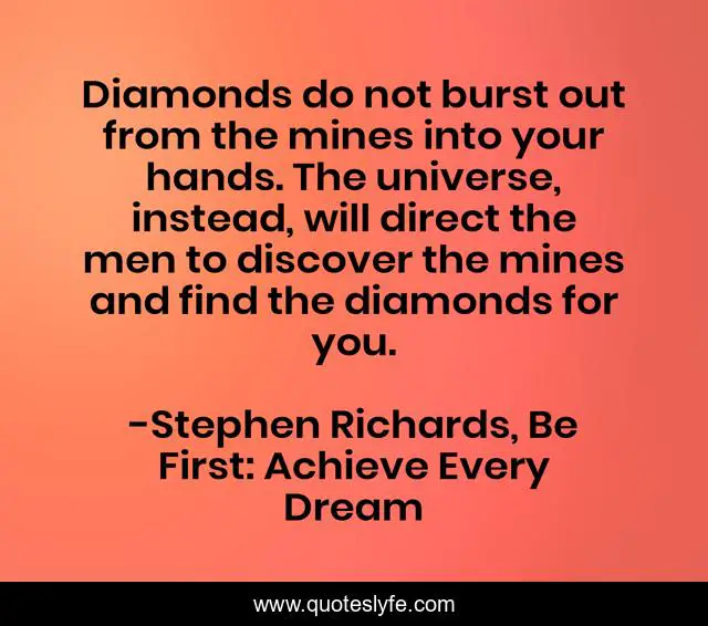 This page presents the quote "Diamonds do not burst out from the mines into your hands. The universe, instead, will direct the men to discover the mines and find the diamonds for you.". Author of this quote is Stephen Richards, Be First: Achieve Every Dream. This quote is about mind-body-spirit, confidence, money, wealth, self-help-book, wealth-creation, law-of-attraction, motivational, positive-thinking,.