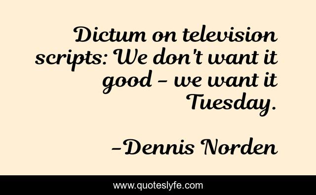 This page presents the quote "Dictum on television scripts: We don't want it good - we want it Tuesday.". Author of this quote is Dennis Norden. .