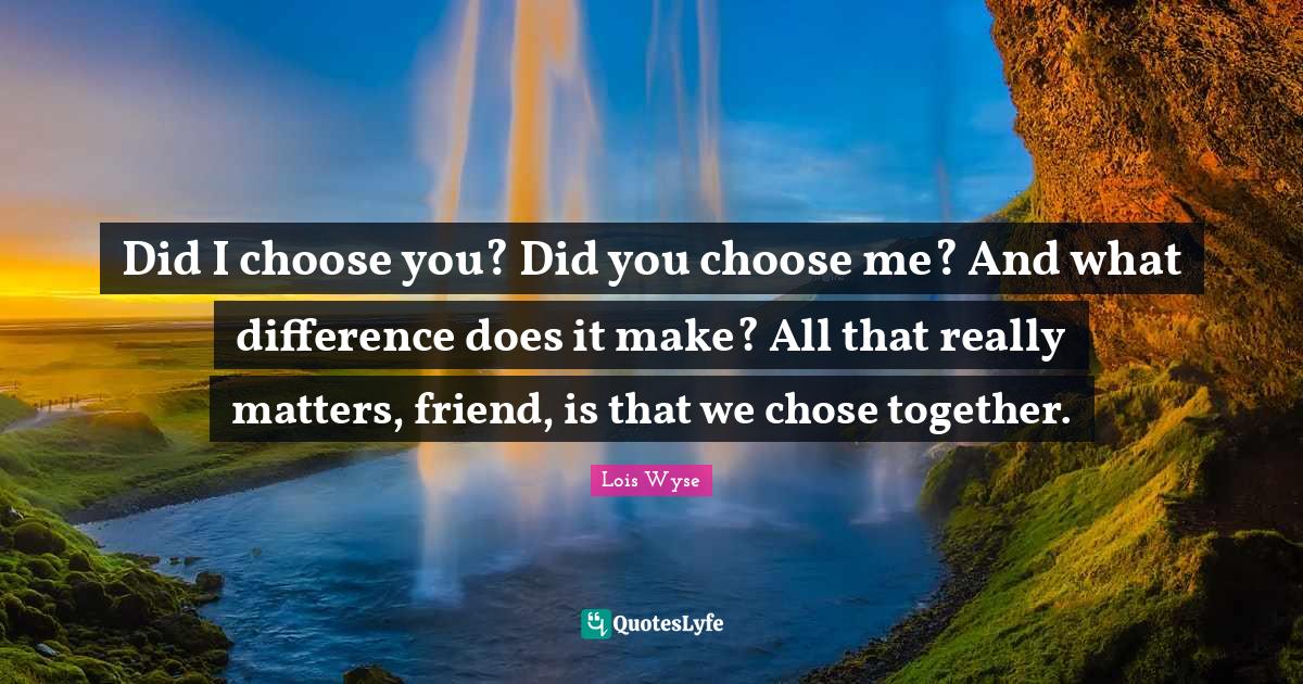 This page presents the quote "Did I choose you? Did you choose me? And what difference does it make? All that really matters, friend, is that we chose together.". Author of this quote is Lois Wyse. This quote is about together, you choose, differences, friendship,.
