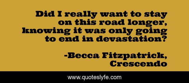 This page presents the quote "Did I really want to stay on this road longer, knowing it was only going to end in devastation?". Author of this quote is Becca Fitzpatrick, Crescendo. This quote is about love, hurt, nora, heartbreak, patch, affection, nora-grey,.