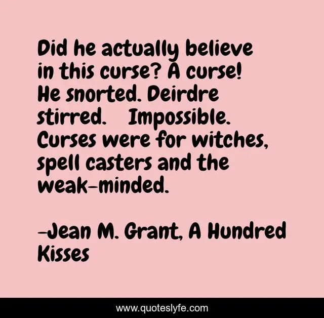 This page presents the quote "Did he actually believe in this curse? A curse! He snorted. Deirdre stirred. Impossible. Curses were for witches, spell casters and the weak-minded.". Author of this quote is Jean M. Grant, A Hundred Kisses. This quote is about ancients, curse, historical-romance, witches, scottish-romance,.