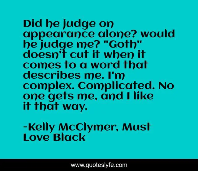 This page presents the quote "Did he judge on appearance alone? would he judge me? "Goth" doesn't cut it when it comes to a word that describes me. I'm complex. Complicated. No one gets me, and I like it that way.". Author of this quote is Kelly McClymer, Must Love Black. This quote is about judgement, love, affection,.