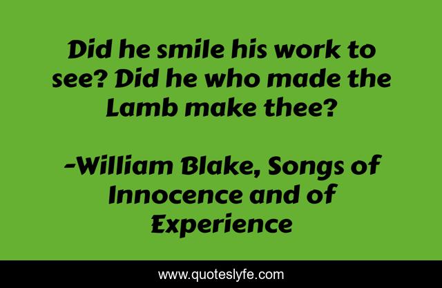 This page presents the quote "Did he smile his work to see? Did he who made the Lamb make thee?". Author of this quote is William Blake, Songs of Innocence and of Experience. This quote is about religion, philosophy,.