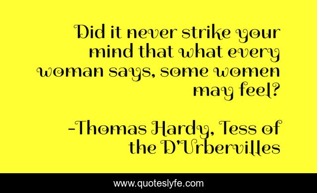 This page presents the quote "Did it never strike your mind that what every woman says, some women may feel?". Author of this quote is Thomas Hardy, Tess of the D'Urbervilles. This quote is about feelings, alec, women, strength, tess,.