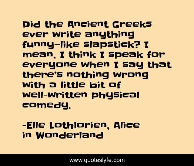 This page presents the quote "Did the Ancient Greeks ever write anything funny—like slapstick? I mean, I think I speak for everyone when I say that there’s nothing wrong with a little bit of well-written physical comedy.". Author of this quote is Elle Lothlorien, Alice in Wonderland. .