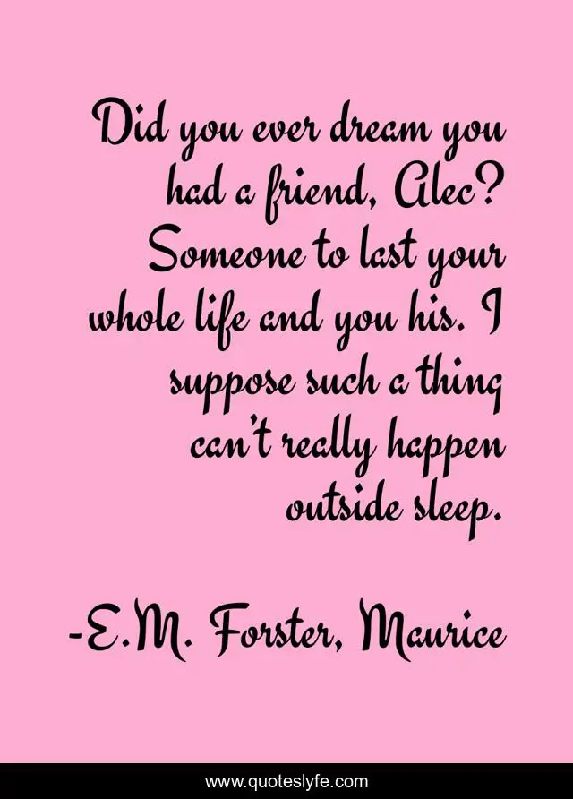 This page presents the quote "Did you ever dream you had a friend, Alec? Someone to last your whole life and you his. I suppose such a thing can’t really happen outside sleep.". Author of this quote is E.M. Forster, Maurice. This quote is about life, friend,.