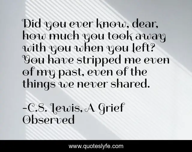 This page presents the quote "Did you ever know, dear, how much you took away with you when you left? You have stripped me even of my past, even of the things we never shared.". Author of this quote is C.S. Lewis, A Grief Observed. This quote is about grief, loss, a-grief-observed, cs-lewis,.