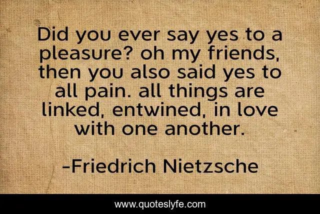 This page presents the quote "Did you ever say yes to a pleasure? oh my friends, then you also said yes to all pain. all things are linked, entwined, in love with one another.". Author of this quote is Friedrich Nietzsche. This quote is about nietzsche, pleasure, pain,.