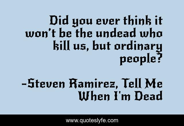 This page presents the quote "Did you ever think it won’t be the undead who kill us, but ordinary people?". Author of this quote is Steven Ramirez, Tell Me When I'm Dead. This quote is about drunk, novel, dead, zombie-thriller, soldiers, paranormal-thriller, horde, na, hordes,.