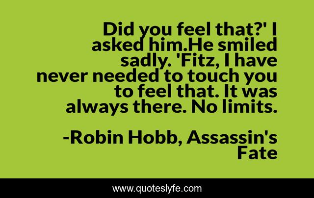 This page presents the quote "Did you feel that?' I asked him.He smiled sadly. 'Fitz, I have never needed to touch you to feel that. It was always there. No limits.". Author of this quote is Robin Hobb, Assassin's Fate. This quote is about connection, love, affection, no-limits,.