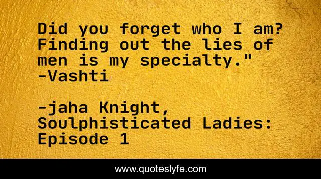 This page presents the quote "Did you forget who I am? Finding out the lies of men is my specialty." -Vashti". Author of this quote is jaha Knight, Soulphisticated Ladies: Episode 1. This quote is about drama, lies, romance, love, affection,.