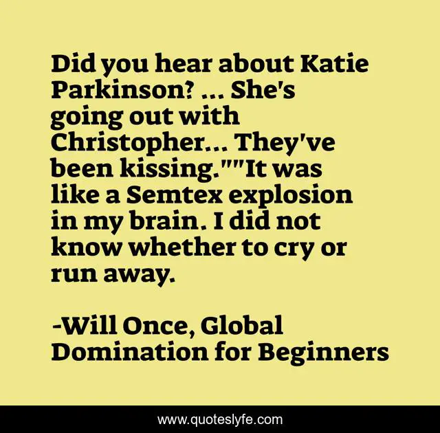This page presents the quote "Did you hear about Katie Parkinson? ... She's going out with Christopher... They've been kissing.""It was like a Semtex explosion in my brain. I did not know whether to cry or run away.". Author of this quote is Will Once, Global Domination for Beginners. This quote is about love, unrequited-love, affection,.