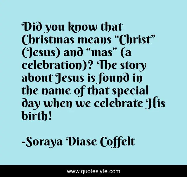This page presents the quote "Did you know that Christmas means “Christ” (Jesus) and “mas” (a celebration)? The story about Jesus is found in the name of that special day when we celebrate His birth!". Author of this quote is Soraya Diase Coffelt. This quote is about children, birthday, facts, jesus, christmas, celebration,.