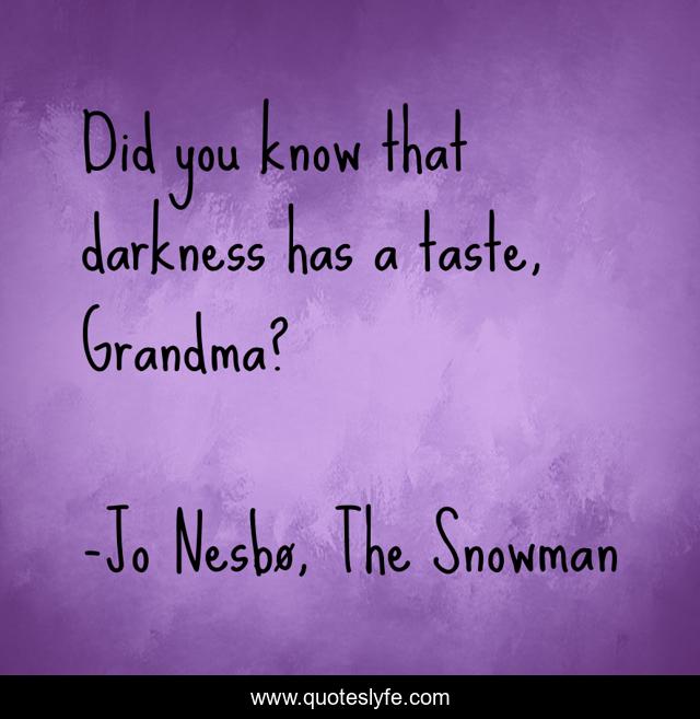 This page presents the quote "Did you know that darkness has a taste, Grandma?". Author of this quote is Jo Nesbø, The Snowman. This quote is about dark, jo-nesbø, darkness, the-snowman, harry-hole,.
