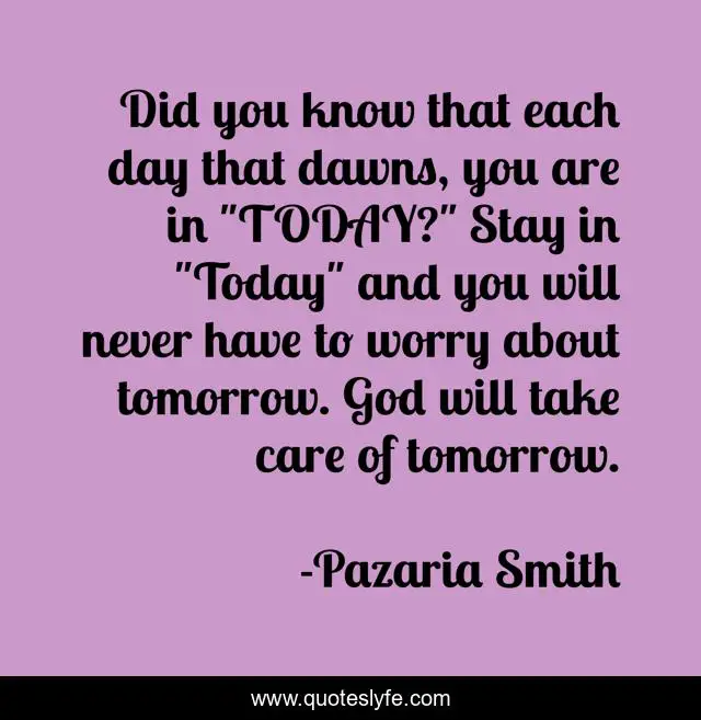 This page presents the quote "Did you know that each day that dawns, you are in "TODAY?" Stay in "Today" and you will never have to worry about tomorrow. God will take care of tomorrow.". Author of this quote is Pazaria Smith. This quote is about faith, today, trust, tomorrow, worry,.