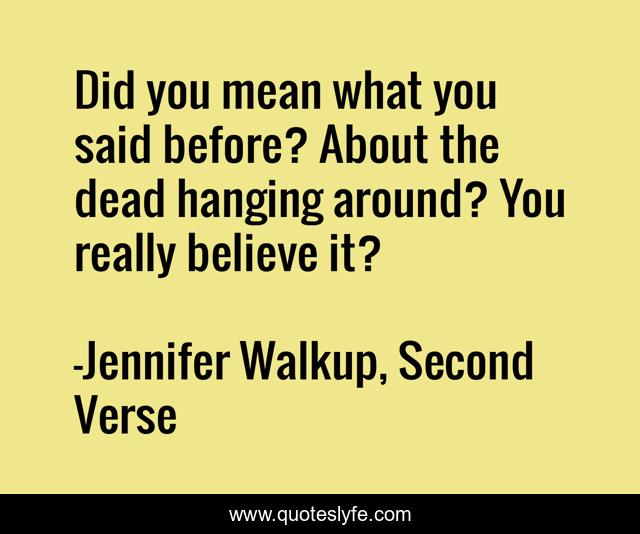 This page presents the quote "Did you mean what you said before? About the dead hanging around? You really believe it?". Author of this quote is Jennifer Walkup, Second Verse. This quote is about mystery, ya, romantic-thriller, paranormal, romance, young-adult-fiction, mystery-suspense, mystery-thriller, young-adult,.
